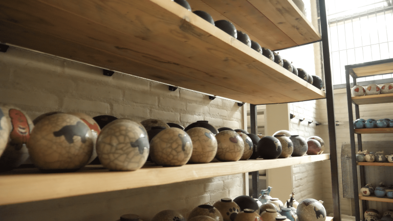 We zijn gestart met het urnenatelier op de monumentale begraafplaats in Capelle aan den IJssel maar na onze verhuizing naar het oosten van het land hebben we eerst vanuit een loods in den Ham gewerkt. Toen kwam het terrein van voormalig munitiecomplex Bruineveld op ons pad. Het terrein waar de Kaasbunker nu gevestigd zit. Hier hebben wij ons begin 2024 gevestigd in het OG gebouw. In dit gebouw werd in de koude oorlog de munitie uitgepakt. Alles is nog zoals het was en dat willen we ook zo houden.